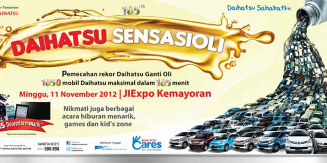 Tahun 2012 sepertinya menjadi tahun yang luar biasa bagi Daihatsu. Setelah berhasil mendapatkan peringkat 1 SSI (Sales Satisfaction Index) JD Power 2012 di bulan Oktober, Daihatsu kembali membuat gebrakan dengan memecahkan Rekor Muri Ganti Oli 1.050 Mobil Daihatsu dalam waktu maksimal 105 menit. Acara yang bertajuk “Daihatsu Sensasioli” ini dilaksanakan di Parkir Barat Pekan Raya Jakarta pada tanggal 11 November 2012. Acara ini merupakan rangkaian kegiatan peringatan ulang tahun Daihatsu yang ke-105 dan sekaligus sebagai bentuk apresiasi kepada Sahabat Daihatsu .