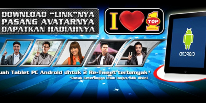 Berikut langkah-langkah detailnya : 1. Download link avatar artis TOP 1 berikut ini : a. Avatar Raffi Ahmad : http://bit.ly/LYVStj b. Avatar Vidi Aldiano : http://bit.ly/K3ReGP c. Avatar Afgansyah Reza : http://bit.ly/KvnLM5 d. Avatar Marchello (ello) : http://bit.ly/MsFIs0 e. Avatar Ayu Ting-Ting : http://bit.ly/N7k1eE 2. Pasang Avatar ini di Profil Picture Blackberry kamu atau Profil Picture Twitter kamu. 3. Follow Twitter TOP 1 (@TOP1Indonesia) dan Facebook (www.facebook.com/top1soul) 4. Capture avatarnya sebagai bukti kalau kamu sudah menggunakannya, lalu kirimkan ke twitter TOP 1 dengan cara : mention @TOP1Indonesia dan terakhir gunakan hastag #ILOVETOP1 5. Ajak teman-teman kamu untuk me Re-tweet hasil postingan kamu. 1 hasil re-tweet dari id twitter temen kamu akan kami hitung sebagai 1 point re-tweet,jadi ajak sebanyak-banyaknya teman kamu yang lain untuk me re-tweet avatar kamu . 6. 25 hasil postingan dengan Re-tweet terbanyak akan mendapatkan kaos Ekslusif dari TOP 1 7. 2 Pemenang Utama dari Kategori Foto Profil Blackberry dan Foto Profil Twitter dengan Re-Tweet terbanyak akan mendapatkan hadiah utama berupa : Tablet PC Android 3GKONTES INI BERLAKU HINGGA 10 JULI 2012.