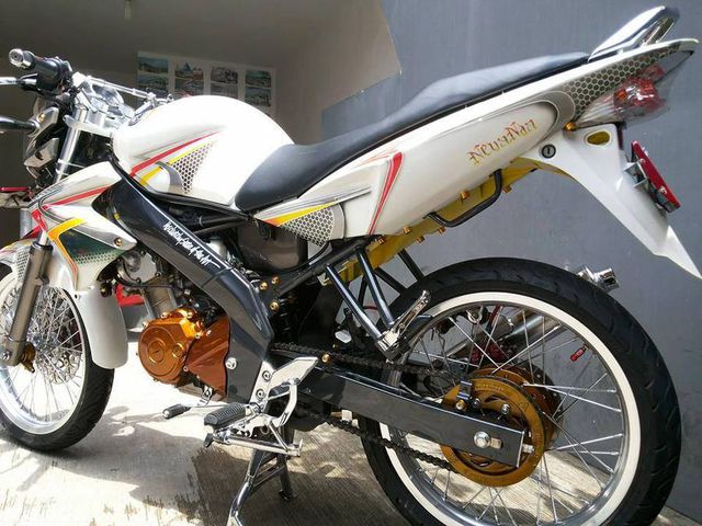 Modifikasi Yamaha Vixion ini tampil minimalis namun terlihat smart dengan balutan warna yang disematkan. Dominasi warna putih dan beberapa grafis 'sarang tawon' yang disematkan membuat motor lansiran tahun 2012 ini semakin menarik.