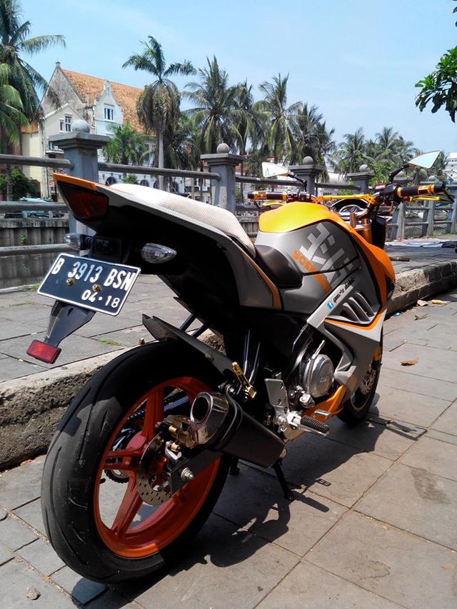 Modifikasi Yamaha New Vixion simpel namun tampil berbeda, dengan sedikit penambahan part tampilan motor ini sudah semakin sporty. Kemudian ditambah dengan permainan warna carah menjadikan tampilan semakin mentereng.