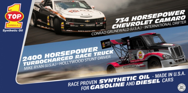 Sejak tahun lalu TOP 1 mendukung Conrad Grunewald, pembalap Formula Drift U.S.A. dengan Chevrolet Camaro bertenaga 734 horsepower. Conrad Grunewald yang pernah menjadi coach TOP 1 Drift Zone telah membuktikan kualitas oli sintetik TOP 1 dalam setiap aksi ekstrim mobilnya di setiap tikungan tajam track balap yang membutuhkan perlindungan maksimal.