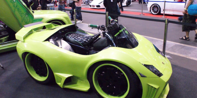 Dengan bodi berwarna hijau muda dan pelek, lampu dan moncong yang dibuat mirip seperti supercar Lambo.