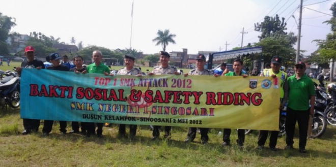 Singosari (02/05/2012). Setelah sukses menyelenggarakan TOP 1 SMK Attack Skill Contest pada hari sebelumnya, bertepatan dengan Peringatan Hardiknas 2012 SMK NEGERI 1 SINGOSARI Kabupaten Malang mengadakan kegiatan Bakti Sosial dan Safety Riding yang didukung oleh PT. Topindo Atlas Asia, PT. Rilon Inverter Welding Machine, dan PT. Telkom Flexi di Dusun Kelampok - Singosari. Acara Bakti Sosial dan Safety Riding SMK Negeri 1 Singosari ini berjalan dengan sukses atas dukungan dari para guru/ siswa anggota panitia TOP 1 SMK Attack Skill Contest 2012 dan siswa-siswi kelas X SMK Negeri 1 Singosari serta jajaran Muspika Kecamatan Singosari.