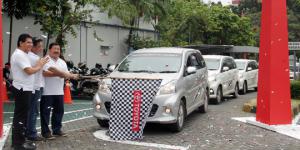 Presiden Direktur PT Toyota-Astra Motor Johnny Darmawan menyambut kedatangan tiga tim Avanzanation Journey 2014 yang berangkat dari Aceh, Pontianak, dan Merauke di garis finish di dealer Auto2000 Tebet Saharjo, Jakarta Selatan, Minggu (9/3/2014)....